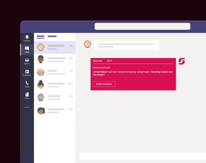 Specscan is geen vervanging van je systemen. Het is de laag die ervoor zorgt dat communicatie, documenten en AI samenkomen in betere projectbesluiten. Je blijft werken in Microsoft Teams en SharePoint zoals je gewend bent. Specscan zorgt dat alles wat daar gebeurt ook daadwerkelijk leidt tot overzicht, inzicht en controle vóór de uitvoering start.